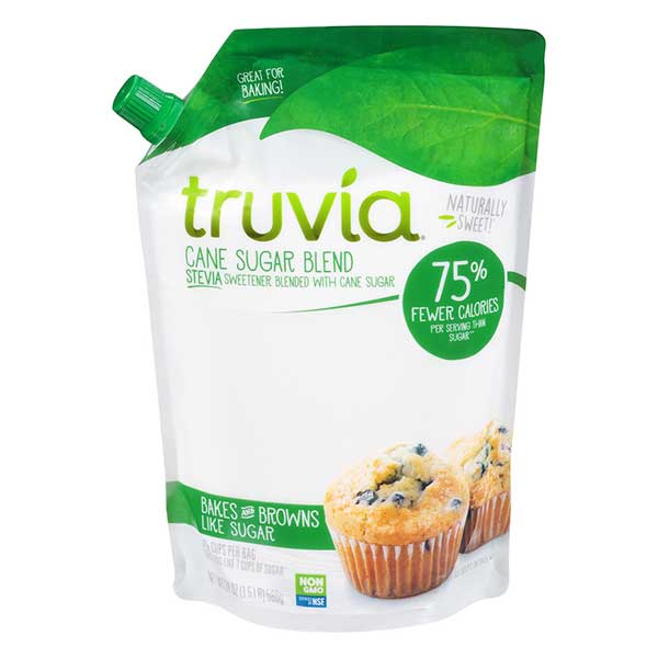 All the sweetness with 25 percent fewer calories per serving than sugar. NEW Truvía® Baker’s Bag Cane Sugar Blend is a reduced-calorie mix of stevia sweetener and cane sugar. You can use it anywhere you’d use traditional sugar because it sweetens, measures and bakes like traditional sugar. 1 cup Truvía® Baker’s Bag Cane Sugar Blend (577 calories) sweetens like 1 cup sugar (770 calories).