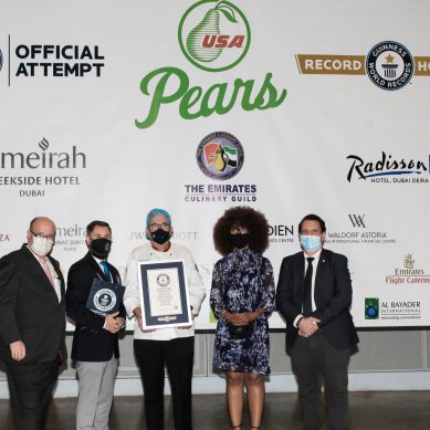 In the new record, 2,209 USA pear pies were produced and displayed in one line. The old record was 1,608 pies.
