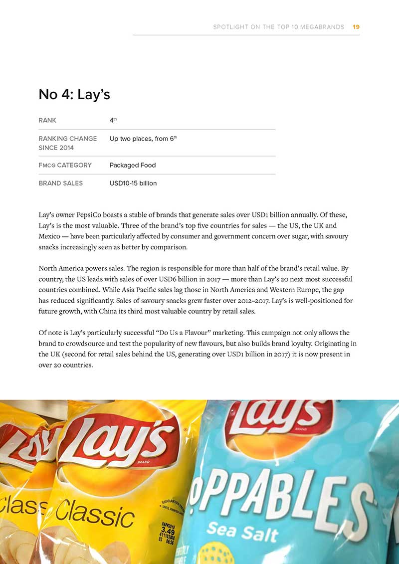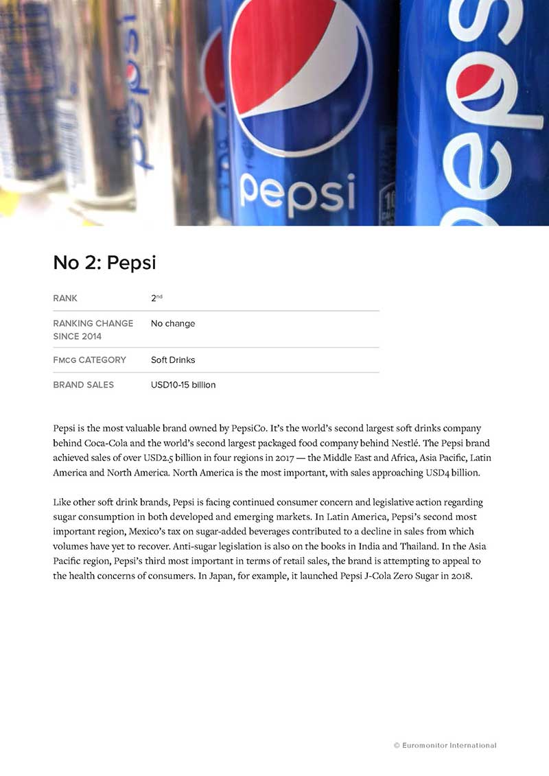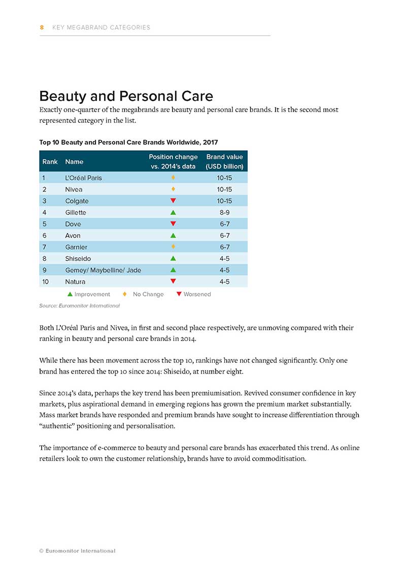 Euromonitor International’s megabrands report is a ranking of the top 100 most successful fast-moving consumer goods (fmcg) brands worldwide. In this report, fmcg encompasses packaged food, soft drinks, beauty and personal care, consumer health, tissue and hygiene, home care, hot drinks and pet care. Each of the brands making it into the top 100 qualifies based on their retail sales value for 2017. It follows a Billion Dollar Brands report we published with the European Supermarket Magazine in 2015, allowing us to compare the positioning of companies today with a historic ranking featuring 2014 data. While several major brands have maintained their ranking for some time, the balance across the list is shifting. People’s attitudes to health and premiumisation are evolving and brands that cannot meet new realities have lost out. Changes in how people research and shop online are having a profound impact. Also, the importance of different regions of the world has changed for many of these megabrands, raising the question of where companies should focus their resources most effectively. Please note that in the situation where more than one legal entity owns a global brand — for example Red Bull or Avon — sales have been combined to indicate brand strength on a worldwide level. The vast majority of the top 100 fmcg brands have one owner globally.